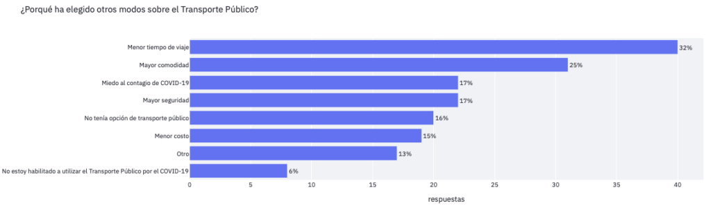 La encuesta aporta información importante sobre los y las usuarias de Moovit que no utilizaron el Transporte Público en la semana previa a la encuesta. En Guadalajara, el 8% del total de personas encuestadas y en donde se debe tener en cuenta que todas las actividades, a excepción de la escolar, han vuelto de nuevo a un estado de actividad normal. De estas personas, el 27% no ha realizado ningún viaje, y otro 26% ha viajado para ir a trabajar. Quienes viajaron en otros medios, lo eligieron frente al transporte público por: “menor tiempo de viaje” (32% de los casos) y “mayor comodidad” (25%) de la alternativa elegida, seguida por “mayor seguridad” (17%) y el “miedo al contagio de COVID-19” (el 17%).