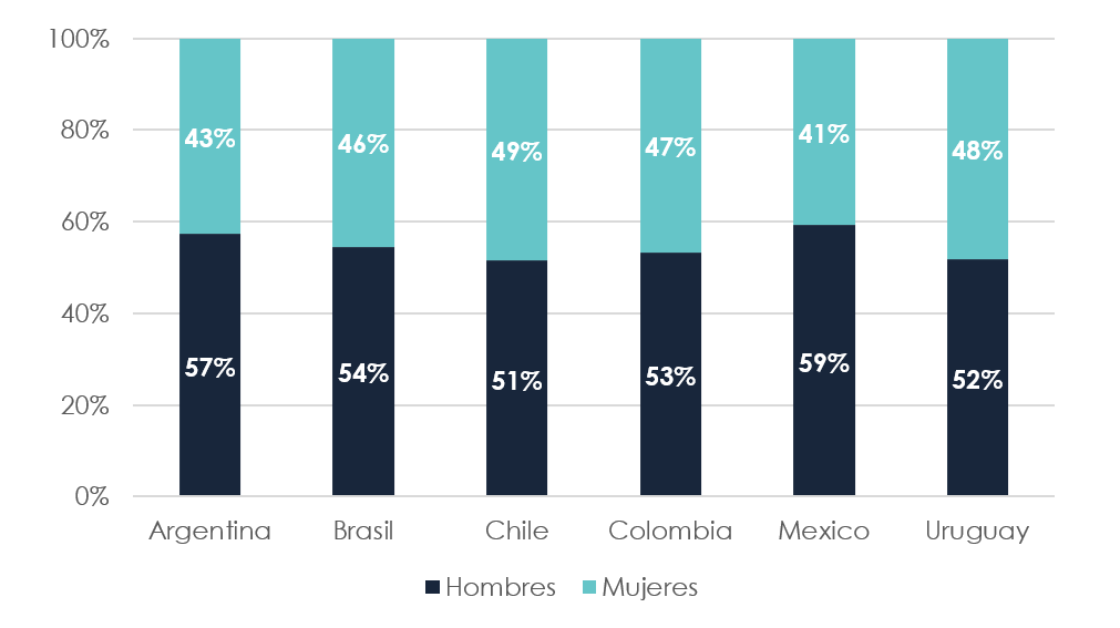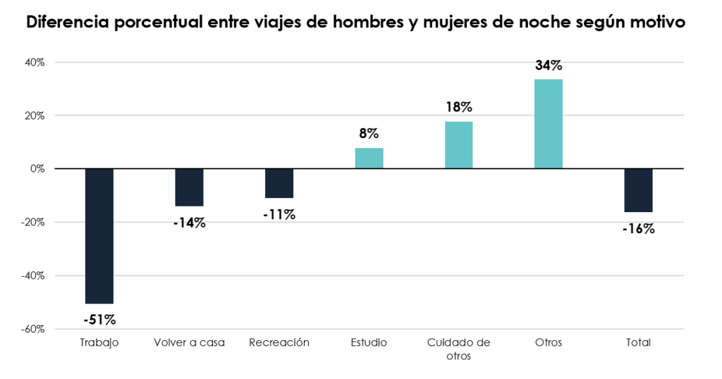 Fuente: Elaboración propia con la información de las encuestas de movilidad para Buenos Aires 2009-2010(Argentina), Sao Paulo 2017 (Brasil), Santiago 2012 (Chile), Bogotá 2019 (Colombia), México City 2017 (México) y Montevideo 2016 (Uruguay).Los resultados de las encuestas de movilidad en la región muestran las grandes limitaciones que tienen las mujeres para desenvolverse en la vida nocturna. Entre las 6 pm a las 6 am, las mujeres en América Latina realizan en promedio 16% menos viajes que los hombres. Estas diferencias resultan aún más dramáticas en países como Argentina y México; donde la cantidad de viajes de mujeres de noche es un 25% y 35% menor en comparación a la de los hombres, respectivamente. En términos de viajes con motivo de trabajo, en promedio, las mujeres realizan 51% menos viajes; lo que representa alrededor de 2 millones menos de empleos para mujeres en los seis países estudiados. Adicionalmente, viajes con motivo de disfrute y ocio son igualmente reducidos con una diferencia entre hombres y mujeres de 12% menos.