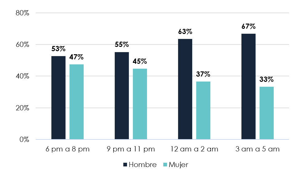Mientras en el día las mujeres realizan una mayor cantidad de viajes, normalmente por sus roles de cuidado y viajes de tipo encadenado, los hombres dominan el espectro de la noche. Así, estás diferencias en el número de viajes según el especto temporal resultan significativas en todos países estudiados. Además, la pertenencia del espacio de los hombres de noche se incrementa y alcanza un pico durante las 3 am y las 5 am.