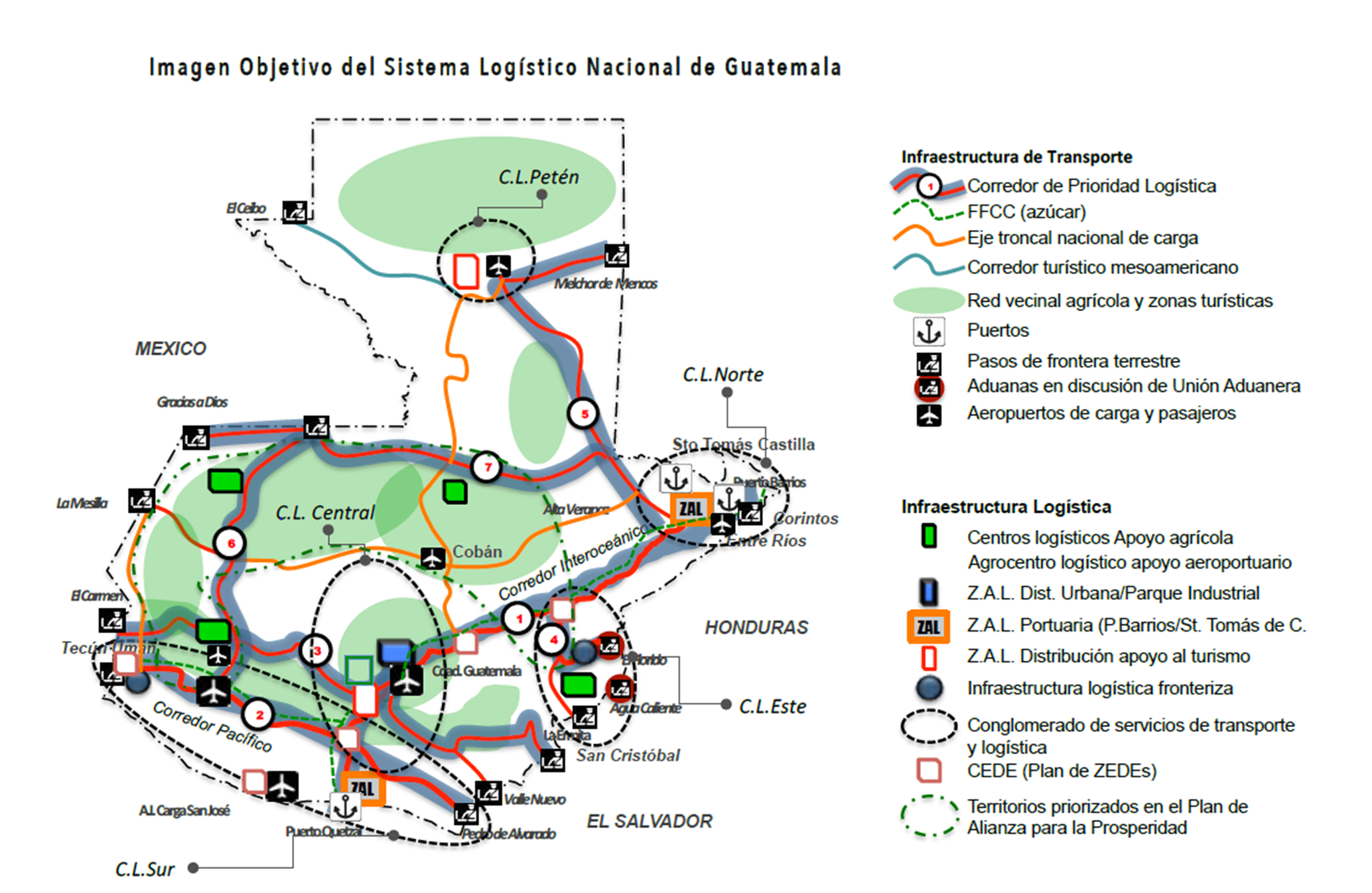 También es importante destacar que varios países han avanzado ya en la implementación y focalización de sus planes logísticos. Por ejemplo, se destaca la ampliación de la red vial de la CA-9 Norte en Guatemala (GU-L1170). Este corredor atraviesa el país del Pacífico al Atlántico y cobra particular relevancia para el transporte de textiles –los cuales reportaron exportaciones por 1,030 millones USD en 2020–; frutas (850 millones USD); combustibles y aceites minerales (508 millones USD); papel y cartón (330 millones USD); plásticos y cauchos (326 millones USD); permitiendo la salida de productos hacia Asia y la Costa Oeste de Estados Unidos a través de Puerto Quetzal y hacia Europa y la Costa Este de Estados Unidos a través de Puerto Barrios y Puerto Santo Tomás de Castilla.