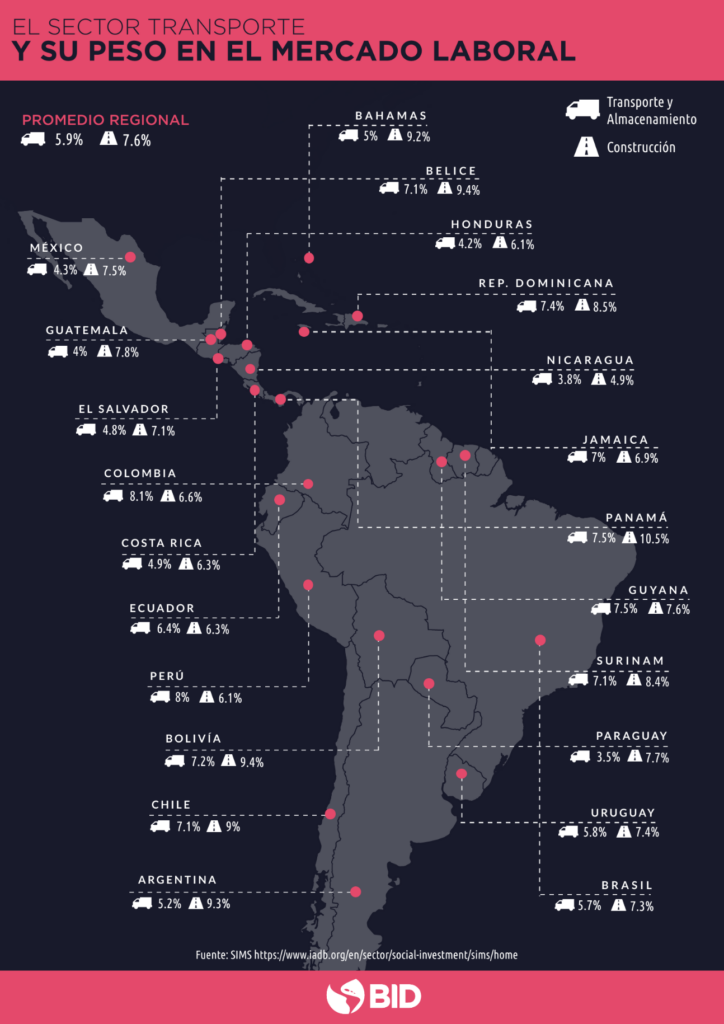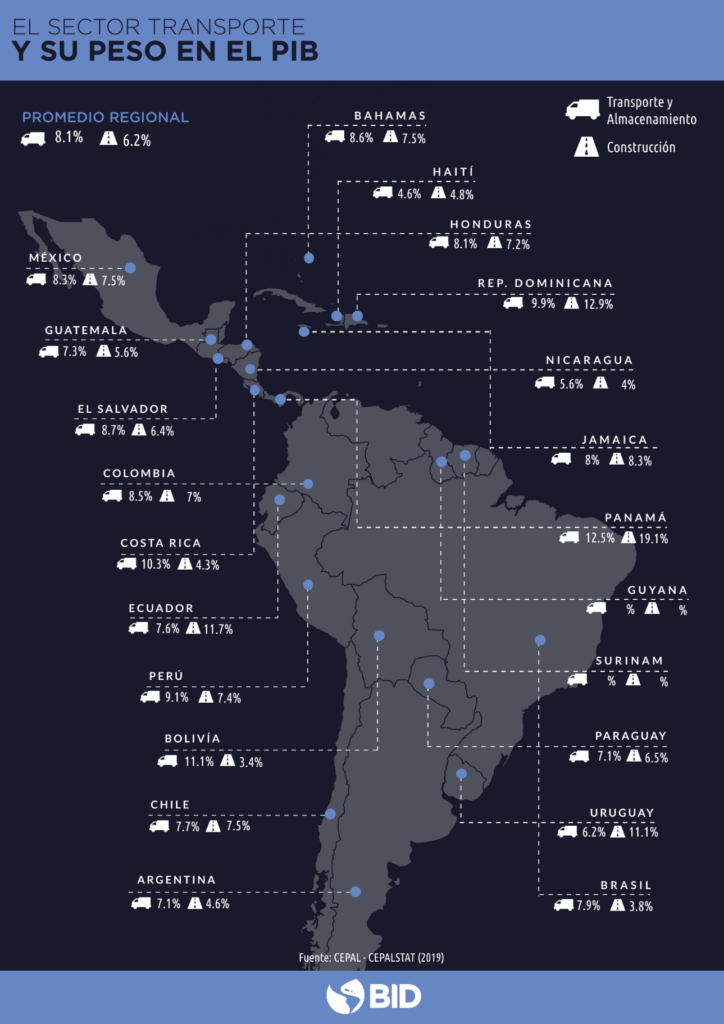 Seguramente, muchas veces han usado datos y cifras sobre la contribución directa del sector en términos macroeconómicos y de ocupación, pero quizá nunca se habían dado cuenta de la importancia y el peso que el transporte tiene en nuestra región. En América Latina y el Caribe los sectores de Transporte y Almacenamiento, y de Construcción representan respectivamente el 8% y el 6% del PIB regional, con picos elevados, como el caso de Panamá, donde ambos sectores llegan a representar más del 31% del PIB.