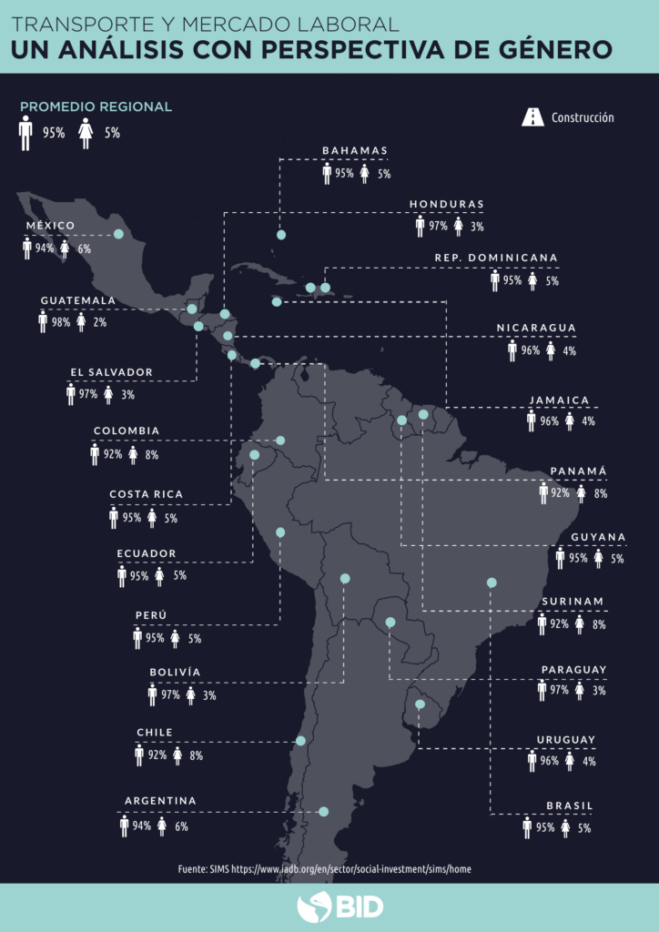 La brecha de género es también particularmente marcada en ambos sectores (imagen 3 y 4). A nivel regional, apenas el 5% de trabajos en el sector de la Construcción son realizados por mujeres, mientras que en Transporte y Almacenamiento esa cifra corresponde a un 18%.
