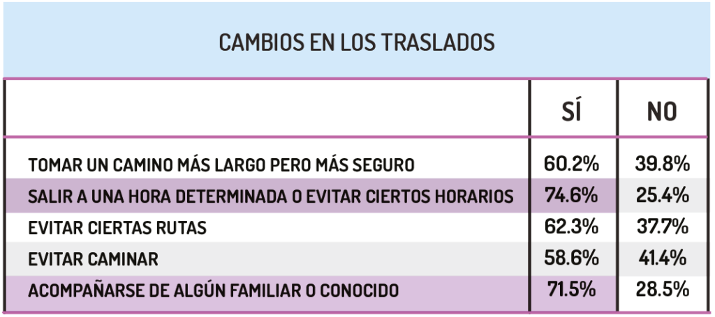 Estudiantes -como Laura-, trabajadoras remuneradas y cuidadoras no remuneradas sufren el mayor número de agresiones en su movilidad. Las usuarias sufren más agresiones al interior de las unidades, seguido de los trayectos desde que bajan del transporte hasta sus destinos. El riesgo de violencia en el transporte y en los trayectos crece dada la iluminación inadecuada, calles y andenes destruidos o de difícil acceso. El 31,2% de usuarias modificaron sus traslados y rutinas por seguridad.