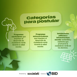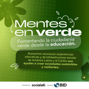 Mentes en Verde es una convocatoria organizada por el BID en colaboración con Socialab, destinada a reconocer programas educativos destacados e infraestructura escolar sostenible y resiliente que fomenten el desarrollo de la ciudadanía verde entre los niños en edad escolar. Esta iniciativa busca identificar experiencias innovadoras en tres categorías: