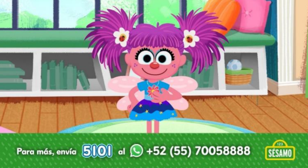 Dado que el modelo se basaba en la televisión, surgió la posibilidad de que pudiera ser escalable, permitiendo que sus efectos alcanzaran a niños y niñas en edad preescolar en toda América Latina y el Caribe. Basado en los efectos de Pequeñas Aventureras en Colombia, con Plaza Sésamo queríamos ampliar ese impacto. Pero ¿cómo escalábamos las conversaciones con los docentes al transmitirlo por televisión? Para extender la conversación más allá de la televisión, decidimos incorporar WhatsApp y un chatbot. Durante la transmisión, el número de WhatsApp aparecía en la parte inferior de la pantalla para que los padres pudieran solicitar actividades e ideas de conversación con sus niños y niñas.