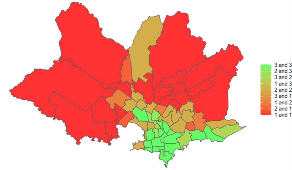Para visualizar los resultados se construyó un mapa-semáforo. El rojo simboliza los barrios que presentaban situaciones más negativas en los 90s y se mantienen así. En verde los barrios que presentaron resultados más positivos y continuaron de esta manera.