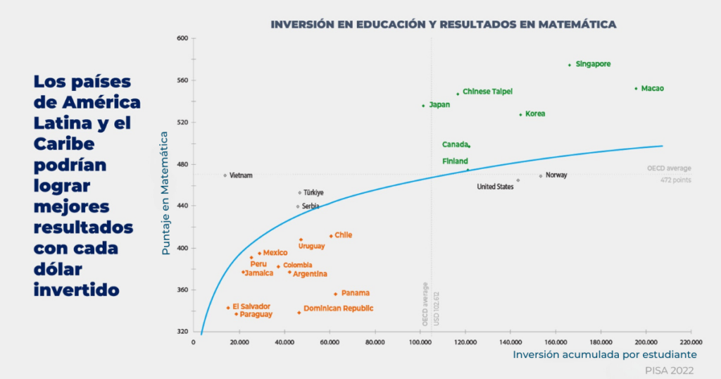 - Pero no solamente no estamos invirtiendo lo suficiente sino que además hay una relación entre inversión y aprendizaje. Y lo que vemos es que con el nivel actual de inversión, podríamos estar mejorando en el aprendizaje. Por tanto, hay un margen para la eficiencia. Los países de la región están por debajo de la línea de tendencia, lo que significa que podrían estar logrando mejores resultados de aprendizajes con cada dólar que invierten.