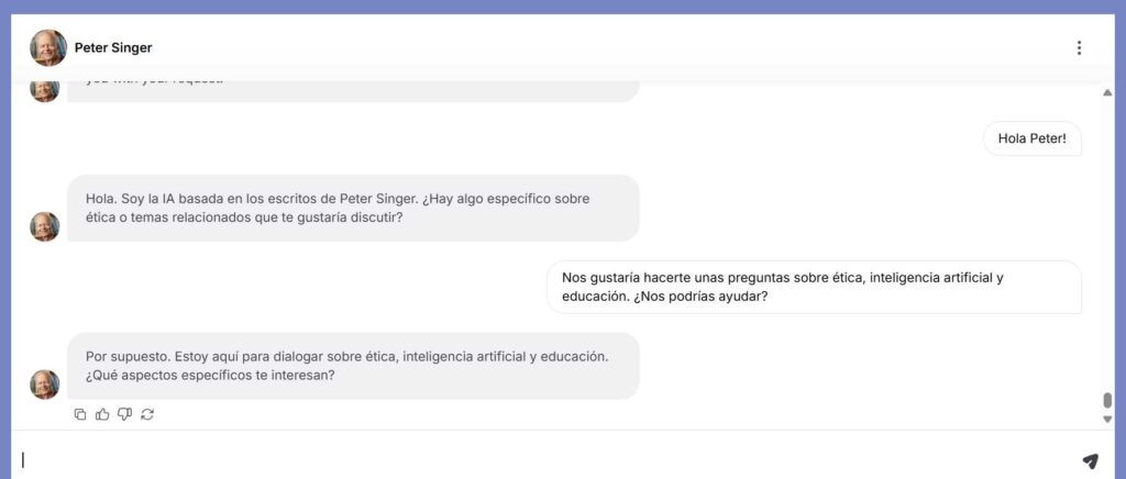 Planteamos algunas de las preguntas más urgentes sobre el papel de la IA en la configuración de las experiencias de aprendizaje, la protección de la privacidad y la prevención de sesgos. Las respuestas que recibimos del chatbot de Peter Singer revelaron perspectivas fascinantes sobre cómo el pensamiento ético puede guiar el desarrollo y uso responsable de la IA en contextos educativos.