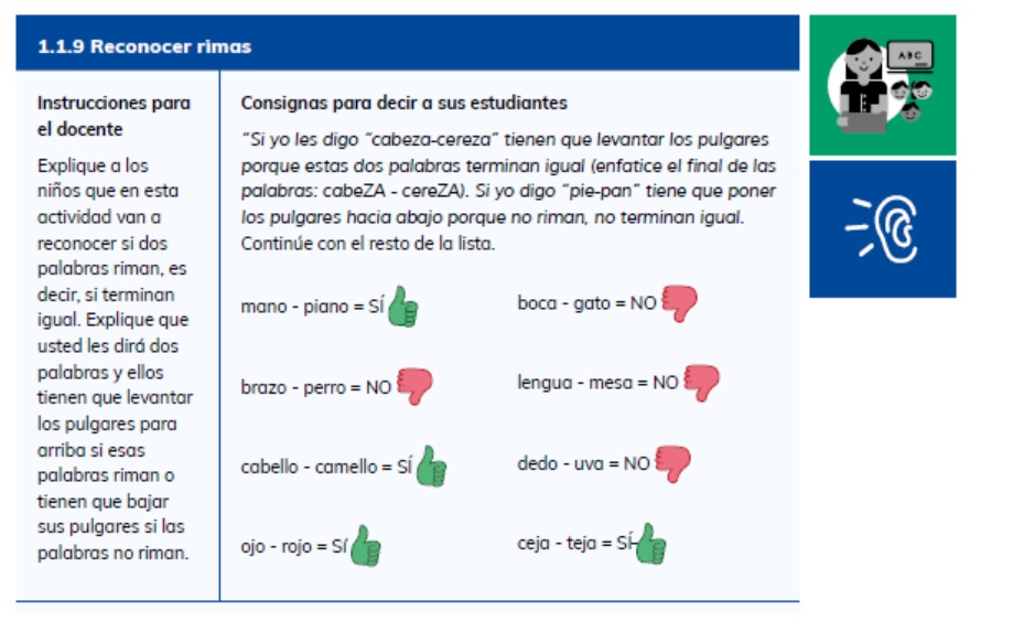 - Conciencia intrasilábica: es una habilidad para identificar y manipular el inicio y rima de las palabras. Esta es una habilidad que se puede trabajar desde el hogar y las escuelas a través de rimas, canciones y poesías.