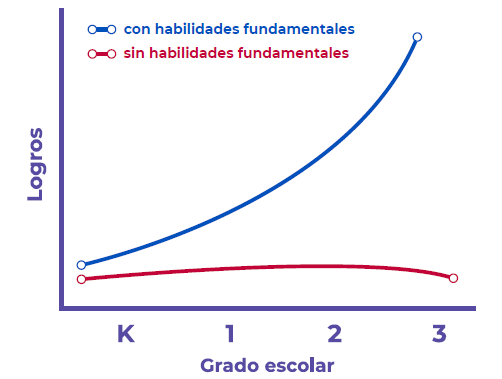 Como ilustra la Figura 1, en la línea azul muestra que los niños y las niñas que inician su educación preescolar (K) con estas habilidades fundamentales tienden a desarrollarlas y a tener trayectorias escolares exitosas. En contraste, la línea roja representa a aquellos que comienzan la escuela sin estas habilidades, quienes enfrentan dificultades constantes que los pueden llevar a la deserción o a avanzar en el sistema educativo sin aprendizaje, perpetuando el denominado efecto Mateo.