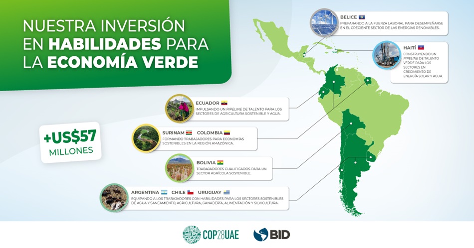 Desde el BID estamos convencidos de que América Latina y el Caribe puede ser parte de la solución a los desafíos asociados con el cambio climático a nivel global. Nuestra región es líder mundial en naturaleza y biodiversidad; 30% de su energía proviene de fuentes de energías renovables, doble que el promedio mundial, y concentra importantes cantidades de recursos que se necesitan en todo el mundo, como litio y cobre, para alcanzar importantes objetivos de sostenibilidad. Esto significa también que, en la medida en la que respondemos al cambio climático y caminamos hacia la carbono neutralidad, sectores económicos y procesos productivos enteros van a transformarse. Se crearán nuevos empleos, y otros se transformarán, reemplazarán, redefinirán o desaparecerán.