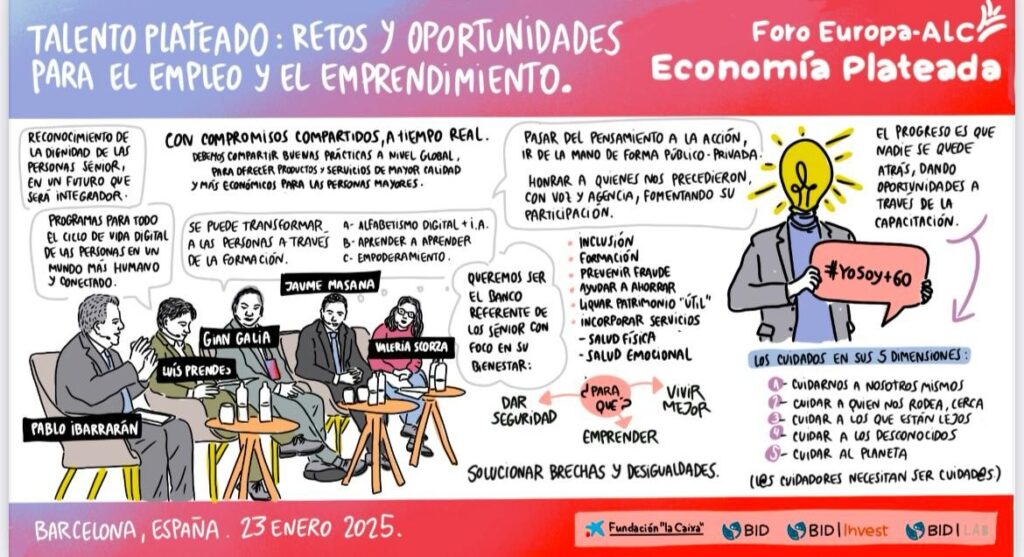 Imagen: Conclusiones del panel ‘Talento Plateado’ en el Foro Europa-ALC de Economía Plateada, enero 2025. Apostar por la economía plateada no significa solo responder a una necesidad demográfica, sino abrazar una visión del desarrollo que impulse la igualdad de oportunidades. Desde el BID, junto a una red de socios globales, estamos comprometidos a promover programas y acciones integrales que impulsen el sector de cuidados (como la iniciativa BID Cuida), las finanzas plateadas y el empleo y emprendimiento de personas mayores.