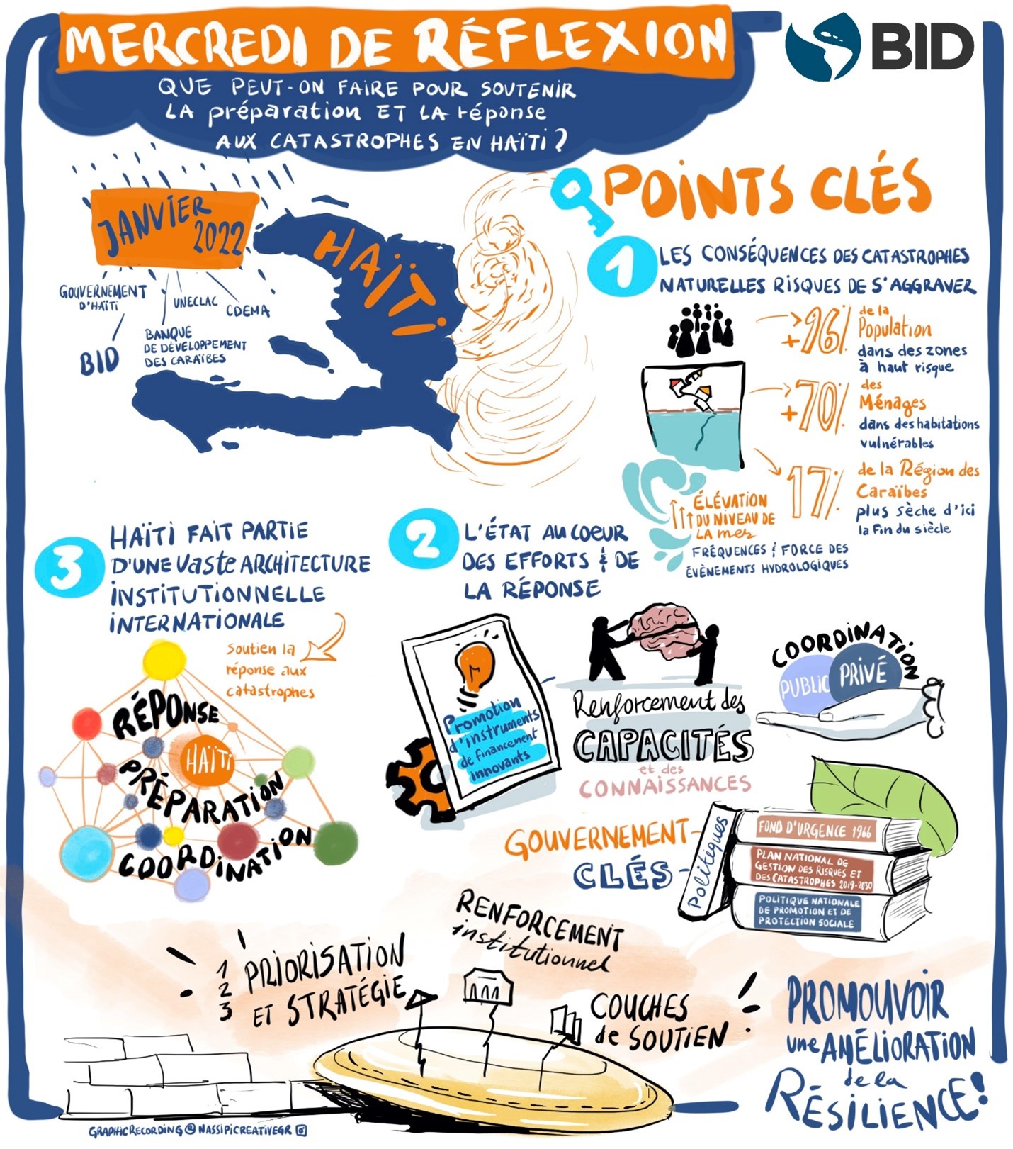 Le Mercredi de Réflexion est une réunion récurrente organisée par le bureau de la Banque interaméricaine de développement (BID) en Haïti, qui offre un espace pour réfléchir à de nouvelles idées et à des développements positifs au milieu du bruit au quotidien. C'est ce qu'ont fait les représentants du Gouvernement Haïtien, d’UNECLAC, de la Banque de développement des Caraïbes et de l'Agence caribéenne de gestion des urgences liées aux catastrophes (CDEMA) lors de la réunion du 26 janvier 2022. Ils ont réfléchi aux actions qui peuvent contribuer à renforcer la résilience et la réponse aux catastrophes en Haïti. Ils ont partagé leurs réflexions sur le sujet et ils ont proposé des solutions possibles. La discussion a fourni des faits, a mis de nouvelles idées sur la table et a souligné trois points: