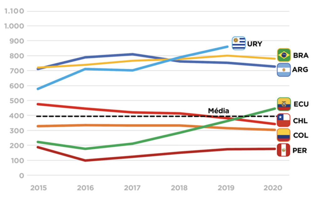 Gráfico 1 - Matrícula em programas de formação inicial docente (FID) por cem mil habitantesFonte: BID, 2023. Quem estuda Pedagogia na América Latina e Caribe? Desafios e Tendências no Perfil do Futuro Docente.