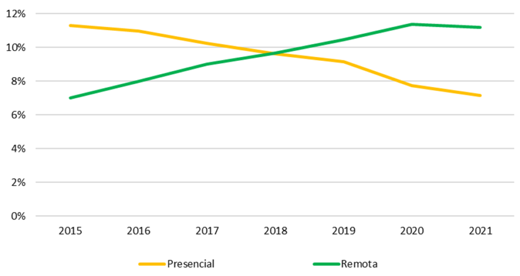 Gráfico 2 - Matrícula em programas de formação inicial docente como porcentagem da matrícula no ensino superior, segundo modalidade de ensino: BrasilFonte: BID, 2023. Quem estuda Pedagogia na América Latina e Caribe? Desafios e Tendências no Perfil do Futuro Docente.