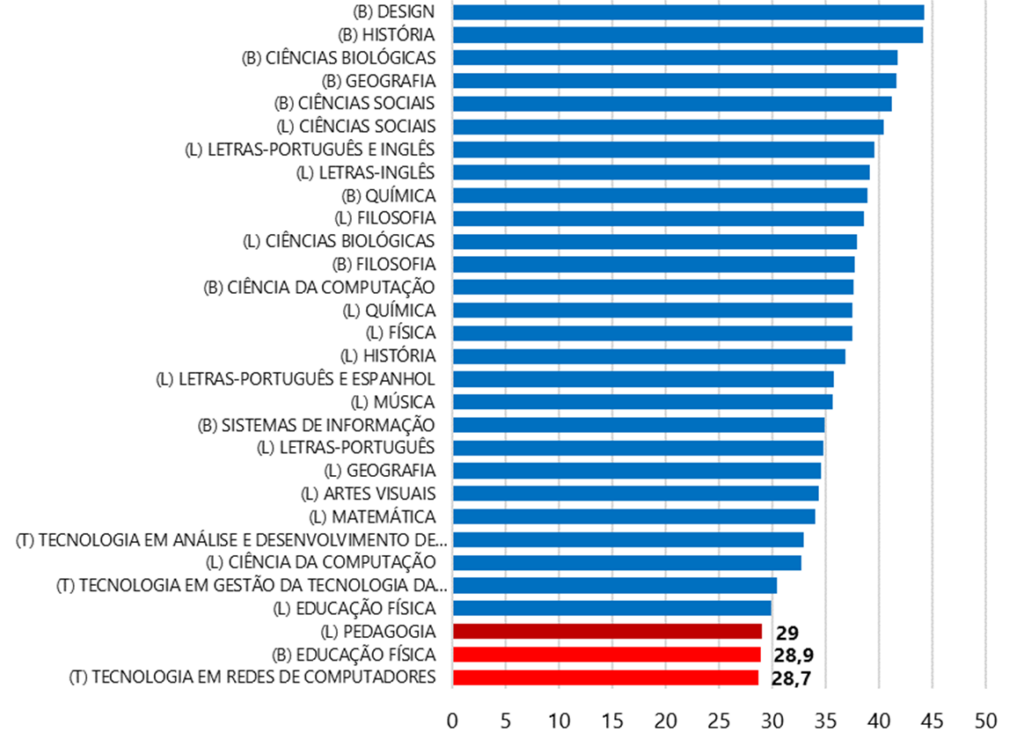 Sabemos que a escolha de carreira é uma decisão multifatorial, mas, no Brasil, a alta concentração de estudantes de nível superior em carreiras docentes associada à baixa seletividade (especialmente dos cursos remotos) e ao baixo rendimento desses estudantes (pedagogia e diversos cursos de licenciatura estão entre as menores pontuações no Enade, gráfico 4)) traz indícios do que chamamos de carreiras de refúgio: a FID é o ticket de entrada no ensino superior. Ingressar na carreira docente por vocação é uma realidade, mas grande parte dos estudantes escolhe a carreira pela facilidade de acesso ao ensino superior e essa facilidade é atrativa para estudantes de menor desempenho acadêmico ou que receberam menos oportunidades educacionais nas etapas anteriores de formação.