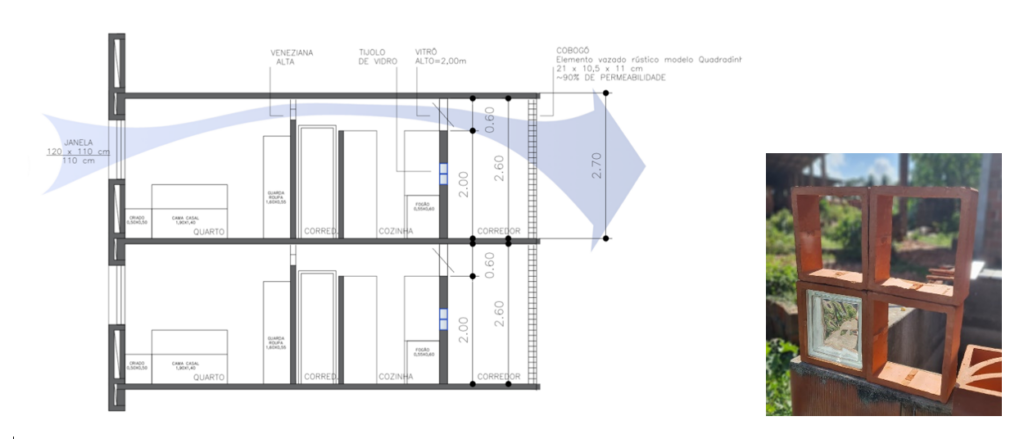 Foram implantados na proposta do projeto conceitos de arquitetura bioclimática como: (i) correta orientação do edifício em relação ao percurso solar e aos ventos predominantes; (ii) planejamento e posicionamento de fachadas e de ambientes de maior permanência dos usuários conforme clima da cidade de João Pessoa; e (iii) uso de espaços abertos e semiabertos e aberturas de fachadas em relação à chegada dos ventos, permitindo a ventilação cruzada no interior do edifício. Além disso, as fachadas próximas aos corredores foram estrategicamente compostas por um material local (cobogó) permeável visualmente, que também permite a ventilação e iluminação natural dos espaços internos como é apresentado no corte esquemático abaixo: