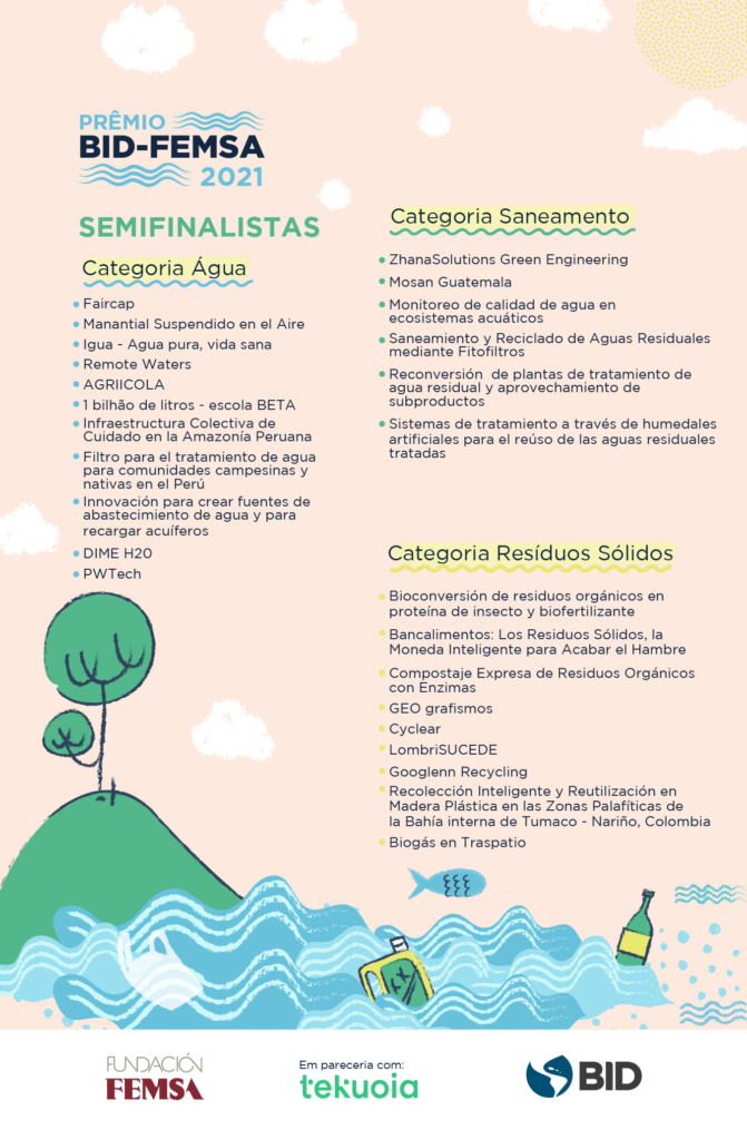 A convocatória do Prêmio BID-FEMSA 2021 foi um sucesso total. Mais de 200 propostas foram recebidas, o que indica mais uma vez que o ecossistema de inovação em água, saneamento e resíduos sólidos na América Latina e no Caribe está ativo e gerando soluções, apesar das condições adversas que a pandemia impôs para o segundo ano de COVID- 19 para a região.