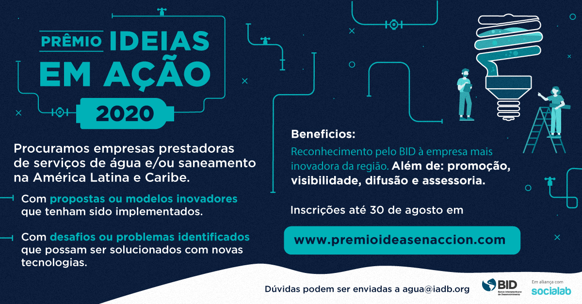 O Prêmio Ideias em Ação incentiva os projetos inovadores desenvolvidos e implementados por empresas operadoras de serviços de água e/ou saneamento na América Latina e no Caribe. Este ano, a convocatória também convida a apresentar desafios enfrentados pelas empresas operadoras de serviços de água e/ou saneamento da região.