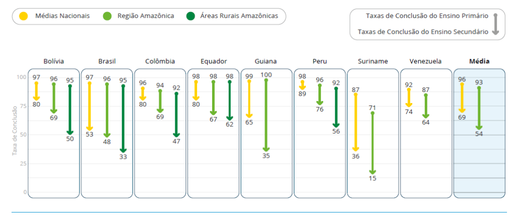 O estudo “Educação na Região Amazônica” , lançado durante o evento em Belém, apresenta uma análise integral e baseada em dados sobre os desafios enfrentados pelos sistemas educacionais regionais nos oito países amazônicos tanto em termos de acesso como de aprendizagem.Um deles: enquanto na América Latina e no Caribe, em média, 69% dos jovens concluem o ensino secundário, nos países da região amazônica esse percentual cai para 54%.