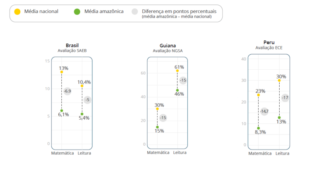 Fontes: Brasil, SAEB 5 (2021); Guiana, National Grade Six Assessment – NGSA (2022); Peru, Evaluación Censal de Estudiantes – ECE, “4º. Grado Primaria” (2022). Gráficos disponíveis na publicação Educação na Região Amazônica.