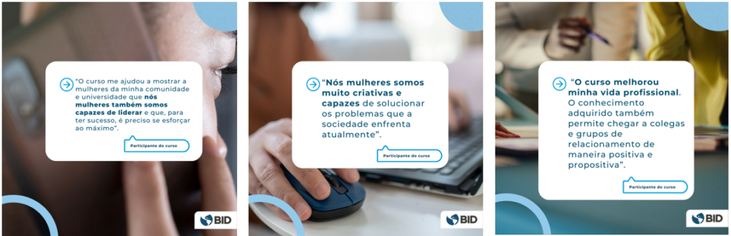 O programa de liderança evolui e se transformou no MOOC “Mulheres na liderança: potencialize suas habilidades e impulsione a mudança”. Lançado inicialmente em espanhol, o interesse foi tão grande que adaptamos o conteúdo para a realidade enfrentadas pelas mulheres caribenhas e traduzi-lo para o inglês. E agora, lançamos uma versão em português totalmente adaptada para o contexto brasileiro.