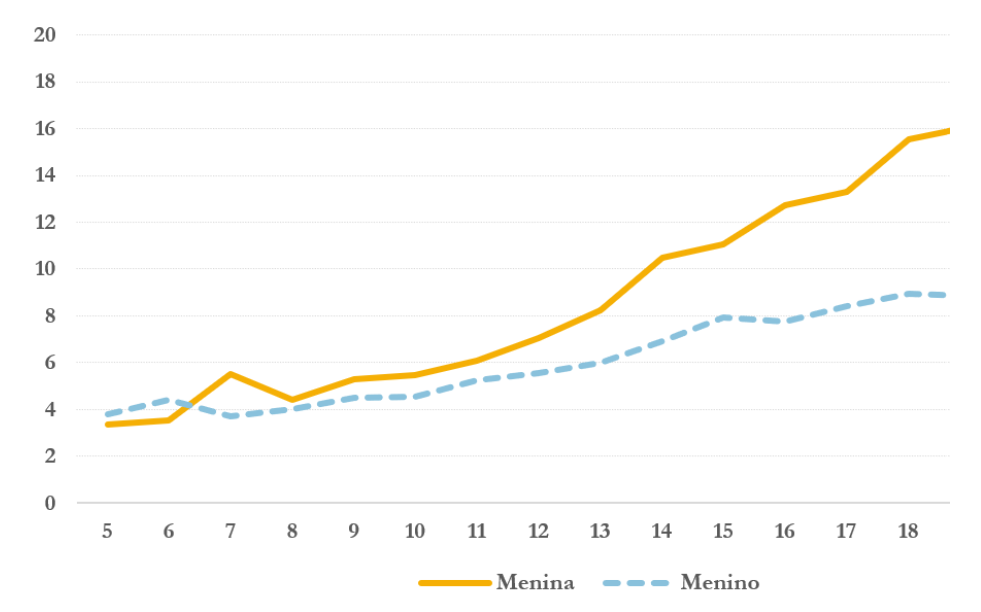 A linha sólida representa as horas médias trabalhadas em uma semana pelas meninas entre 5 e 18 anos, e a linha pontilhada representa as horas médias trabalhadas pelos meninos na mesma faixa etária. Aos 18 anos, as meninas fazem quase o dobro do trabalho doméstico que os meninos.