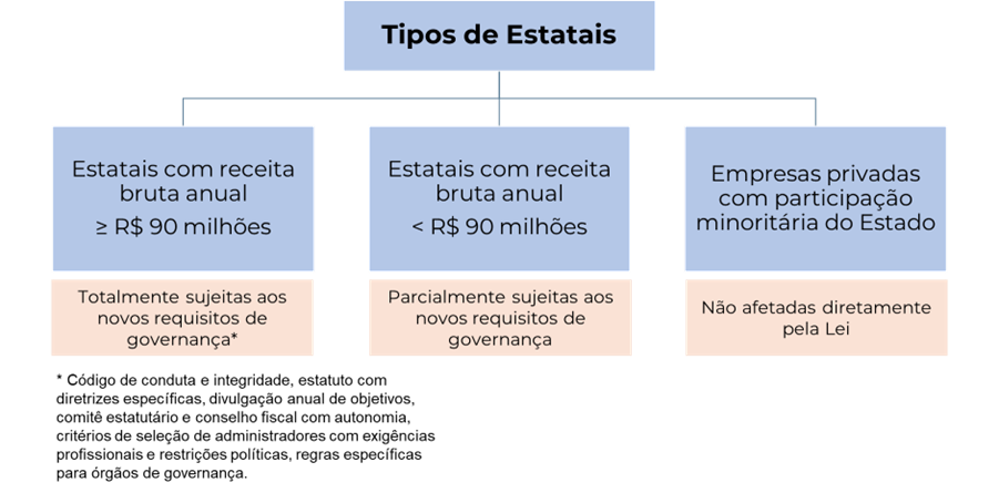 Neste contexto, foi promulgada em junho de 2016 a Lei das Estatais no Brasil (2). A legislação representou um marco importante na regulamentação das empresas estatais no país, e embora a Lei englobe toda e qualquer empresa pública e sociedade de economia mista da União, dos Estados, do Distrito Federal e dos Municípios, foram estabelecidos requisitos mais rigorosos para empresas com receita bruta anual acima de R$ 90 milhões, conforme apresentado na Figura 2.