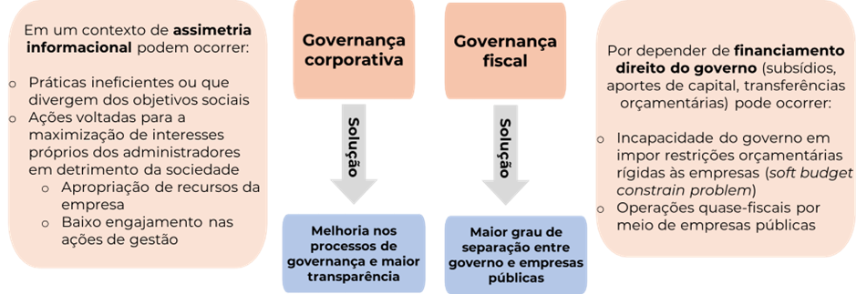 Problemas de governança nas empresas estatais derivam de dois principais tipos: de governança corporativa, que se refere ao conjunto de práticas, políticas e estruturas que regulam a maneira como as empresas são dirigidas, administradas e controladas, e de governança fiscal, definido como o conjunto de práticas e processos destinados a garantir a transparência, legalidade e eficiência na gestão dos recursos financeiros e fiscais das empresas. A figura abaixo sintetiza os principais desafios em relação aos problemas de governança para as estatais.