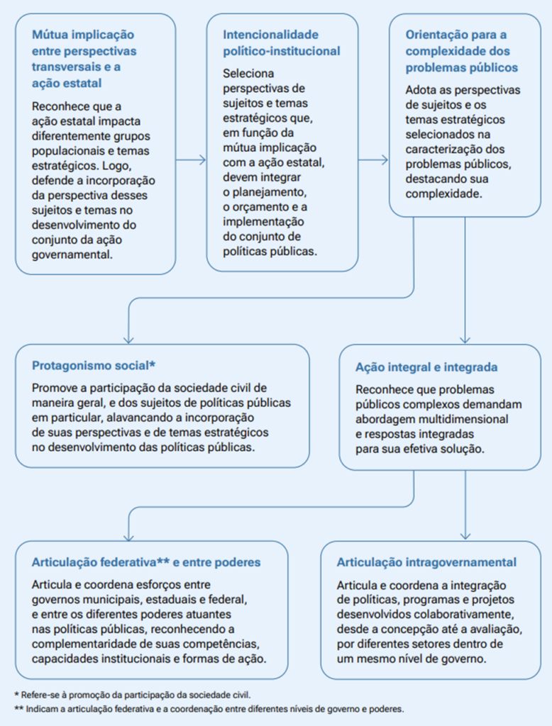 A operacionalização desta estratégia pressupõe o reconhecimento do caráter multidimensional dos desafios enfrentados e a adoção de abordagens de gestão inovadoras, baseadas na ação integrada entre órgãos e setores dentro de um mesmo nível de governo, na articulação entre entes federativos e os diferentes poderes, e no protagonismo social no desenvolvimento de políticas públicas. Em síntese, a transversalidade se baseia nos seguintes princípios norteadores: