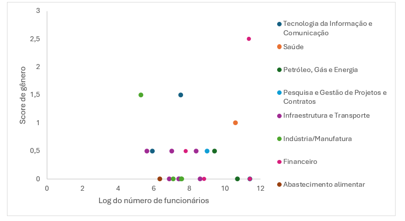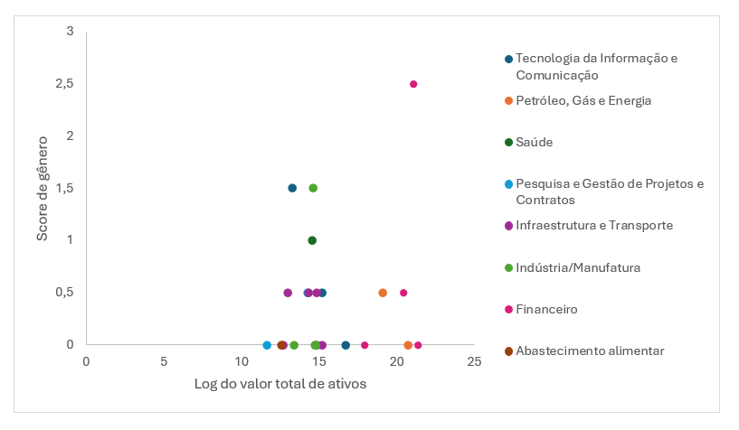 Também diferentemente do componente ambiental, o score de gênero aparenta ter pouca ou nenhuma correlação com o tamanho das EEs, tanto em valor total de ativos quanto em número de funcionários.