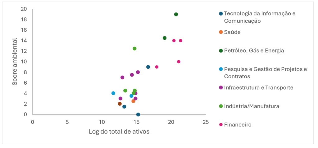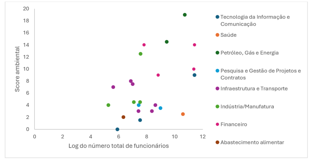 Vale ressaltar que a correlação entre o tamanho da empresa e os scores ambientais não se deve apenas às pressões externas. Também podem existir outras explicações plausíveis, que não são mutuamente exclusivas, como por exemplo o fato de empresas maiores terem mais recursos e capacidades para planejar e executar estratégias ambientais.