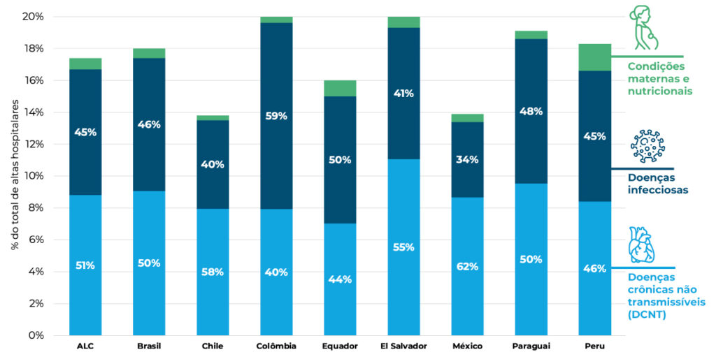 Esta figura mostra a porcentagem do total de altas hospitalares devido a ACSCs nos oito países e para a média da ALC. Cada barra reflete a parcela do total de altas atribuíveis a ACSCs e é dividida em três segmentos que representam a composição dessas altas: doenças crônicas não transmissíveis (mostradas em azul claro), doenças infecciosas (azul escuro) e condições maternas e nutricionais (verde). O gráfico permite comparar tanto a extensão da utilização hospitalar por ACSCs quanto os tipos de condições que levam a essas internações nos diferentes países. Os dados representam a média para o período de 2015 a 2019.