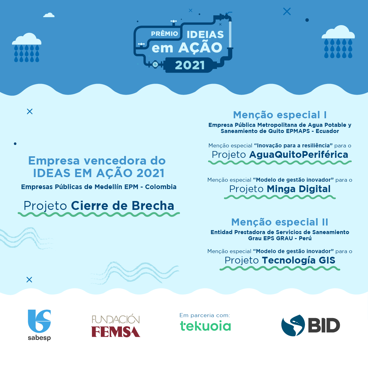 O vencedor do Prêmio Ideias em Ação, patrocinado pela Sabesp, foi o Projeto Fechando a Lacuna, apresentado pelas Empresas Públicas de Medellín. Os vencedores do Prêmio BID-FEMSA são: RENAR Estratégia Verde, na categoria Água; Zhana Solutions, na categoria Saneamento; e Dipterra, na categoria Resíduos Sólidos.
