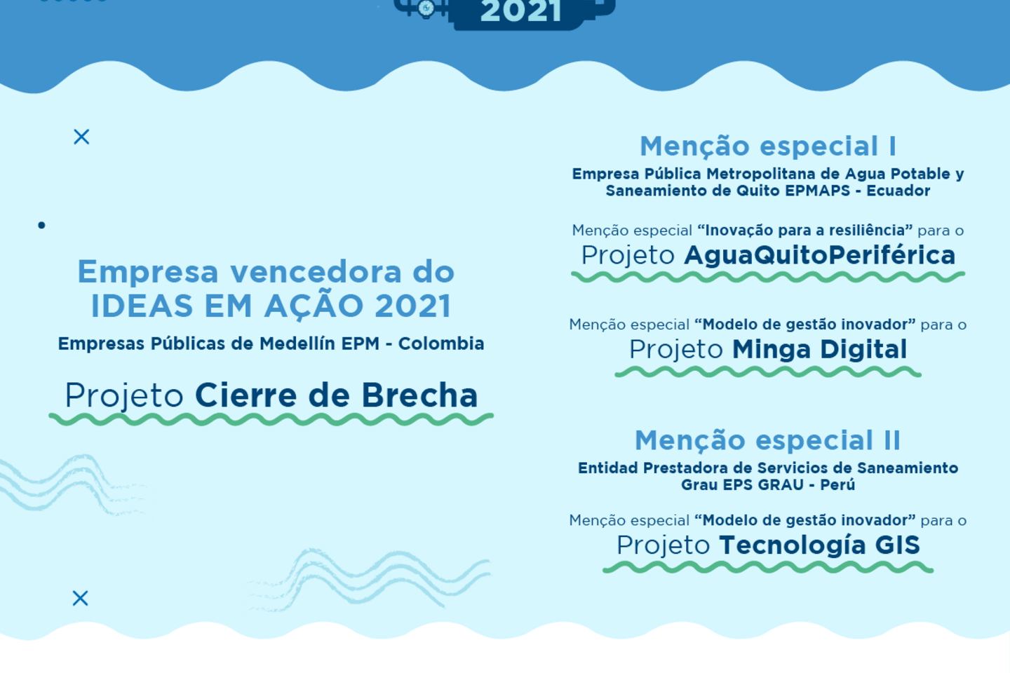 Prêmio Ideas em AçãoO júri também concedeu na mesma cerimônia o Prêmio à empresa de água e saneamento mais inovadora da América Latina e Caribe, que recebeu como prêmio um workshop de mentoria de uma semana na Sabesp em São Paulo, Brasil; conhecer o Laboratório de Inovação daquela empresa, que faz parte do seu modelo de gestão da mudança e inovação, bem como aconselhamento para a implementação do Aquarating+ e um pacote de promoção e visibilidade para a empresa. A empresa vencedora é: