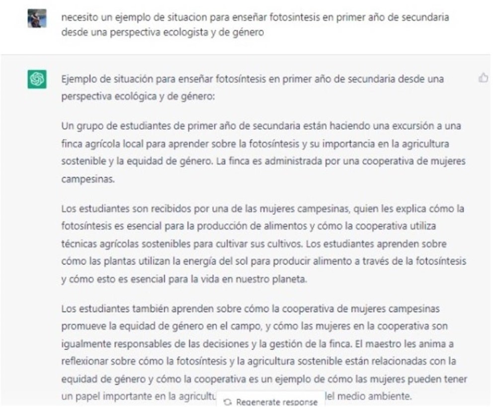 Por exemplo, pedimos ideias para ensinar sobre fotossíntese no primeiro ano do ensino médio. Depois da resposta, para testar - e brincar um pouco -, ampliamos nossa demanda e pedimos que nos dissesse também como ensinar sobre fotossíntese a partir de uma perspectiva ecológica e de gênero. Ainda estamos boquiabertos e sorrindo: