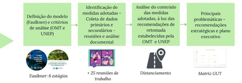 Foram usados como referencial o modelo de gestão de crises no turismo proposto por Faulkner, além de orientações estabelecidas em nível internacional para a gestão específica da crise causada pela pandemia de Covid-19, tanto pela Organização Mundial do Turismo como pelo Programa das Nações Unidas para o Meio Ambiente. Estes referenciais permitiram que fosse feita uma leitura da situação e um desenho das recomendações que seriam discutidas durante a elaboração do plano de retomada.