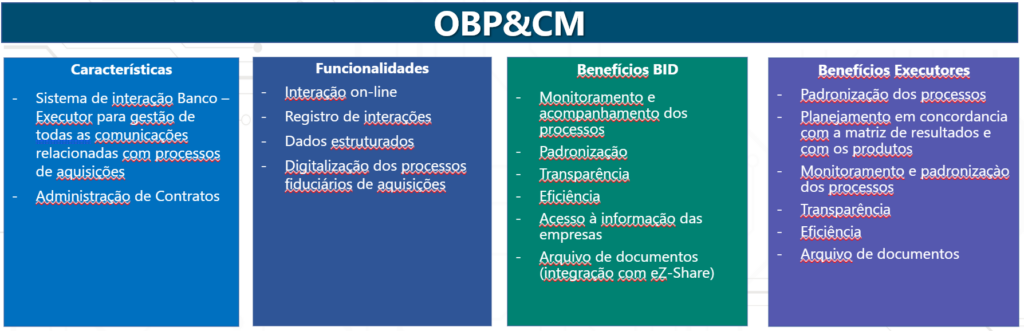 Sistema OBP&CM já foi implementado em 8 paísesPara se ter uma ideia, a cada ano, o BID registra mais de 35.000 interações relacionadas somente à supervisão das operações que nossos mutuários executam nos 26 países em que atuamos. Os primeiros módulos a entrarem em cena nesta nova plataforma serão os relacionados ao planejamento das compras, à supervisão dos processos licitatórios e à gestão dos contratos com fornecedores e empreiteiros (Online Bidding Process & Contract Management – OBP&CM).