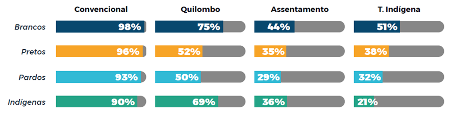 Fonte: O Círculo Vicioso da Desigualdade Racial na Educação do Brasil, com base nos microdados do Censo Escolar 2020 (INEP).Na educação básica, estudantes pretos, pardos e indígenas estão matriculados em escolas com menos infraestrutura e acesso a materiais de ensino aprendizagem. Enquanto 98% dos estudantes brancos estão matriculados em escolas convencionais (ou seja, aquelas que não estão em territórios como assentamentos, quilombos ou territórios indígenas) que contam com acesso a água, energia, saneamento e coleta de lixo, apenas 21% de estudantes indígenas que estudam em território indígena têm a mesma infraestrutura mínima à disposição.