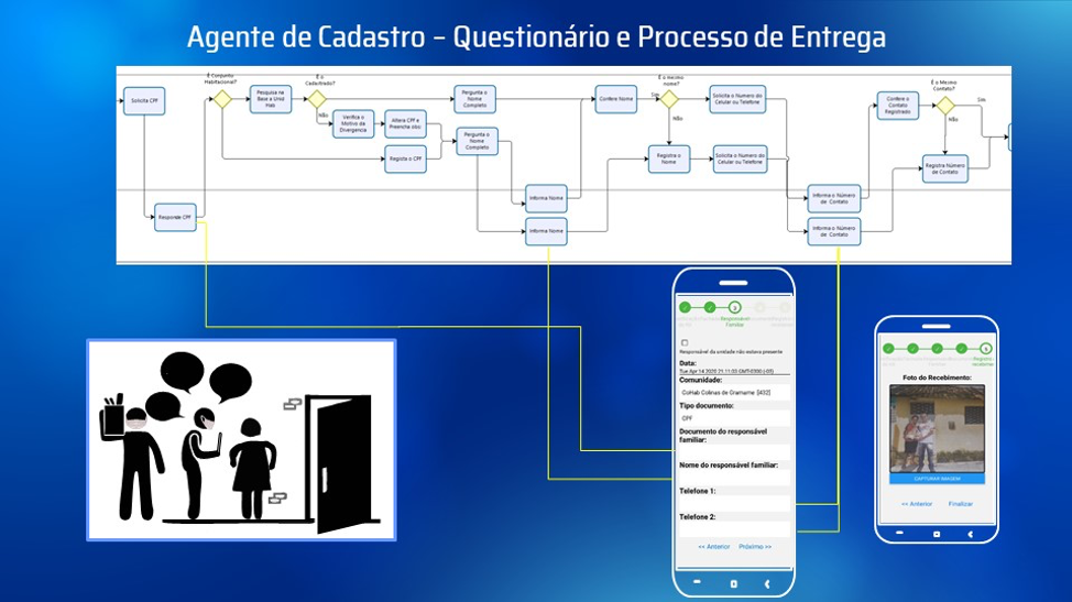 O aplicativo, utilizável tanto online como offline, foi instalado em tablets utilizados pelos agentes de campo, que foram previamente treinados para seu uso. Através de um sistema de QR code, os agentes escaneiam individualmente cada cesta, e a vinculam à localização georreferenciada de uma unidade habitacional onde está sendo entregue, junto com informações sobre o/a chefe de família. Especificamente para as oito comunidades que compõem o Complexo Beira Rio, território objeto de intervenções urbanas do Programa João Pessoa Sustentável, uma curta pesquisa é realizada no momento da entrega, permitindo atualizar alguns dados de base sobre as famílias e as situações habitacionais. Estes dados, de uso exclusivo e confidencial da Prefeitura, permitirão uma melhor preparação de todas as atividades subsequentes previstas no âmbito do Programa João Pessoa Sustentável.