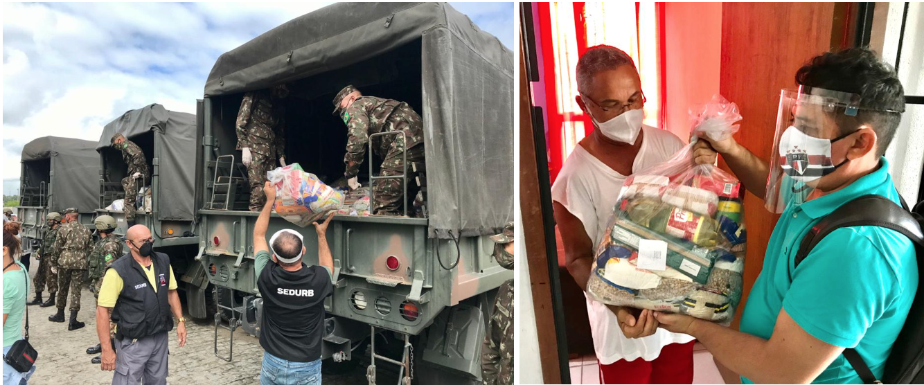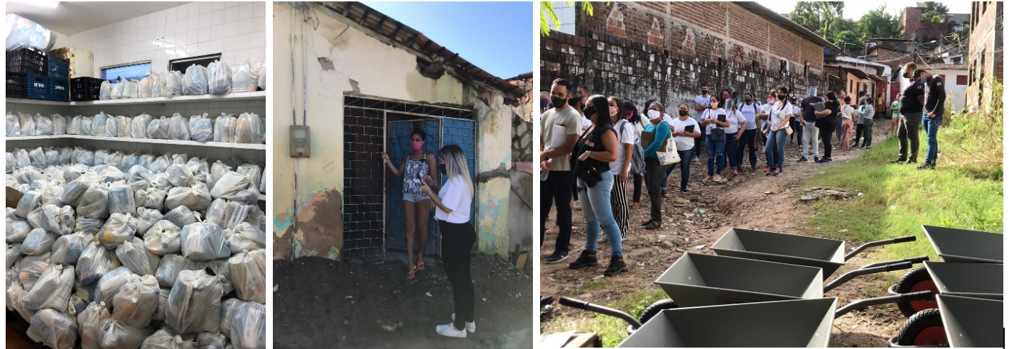 Isso foi o que nos levou a optar juntos pela realização de uma atividade piloto para o Centro: uma ação de combate à fome, visando apoiar 10.400 famílias das zonas social e economicamente mais vulneráveis da cidade (comunidades precárias e conjuntos de habitação de interesse social). A insegurança alimentar destas populações e a urgência sanitária justificaram priorizar a distribuição de cestas básicas e kits de higiene e limpeza, enquanto as restrições do distanciamento social e as precauções de base na ação humanitária (conceito universal do do not harm que requer que quem ajuda, ao acudir, não coloque o beneficiário numa situação de risco) levaram para a opção de uma distribuição do tipo porta-a-porta.