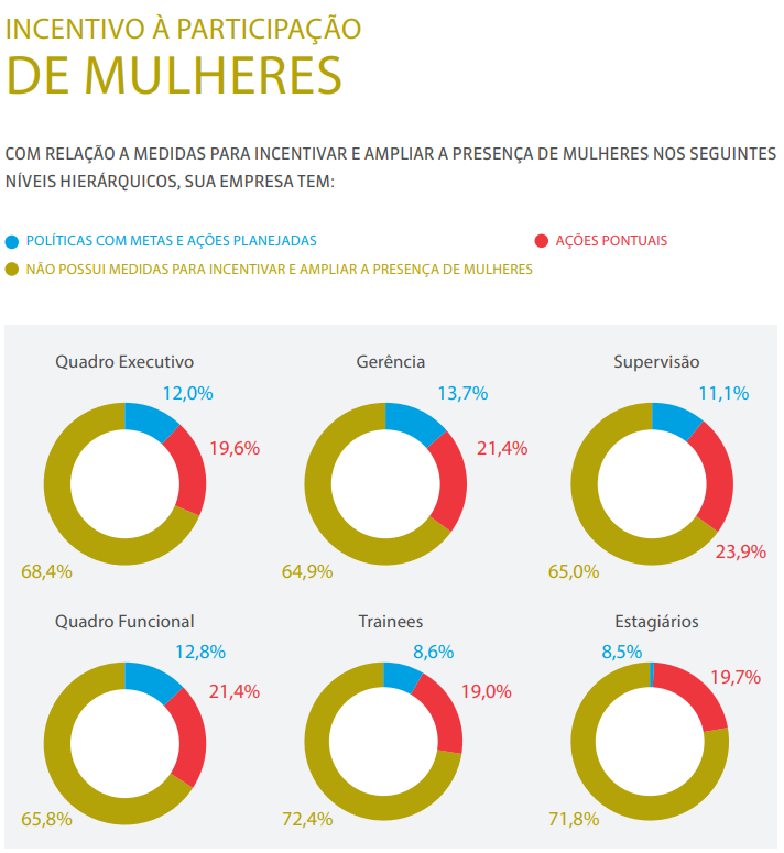É mais exígua ainda a presença de mulheres negras rumo ao topo das empresas, ocupando 10,3% do nível funcional, 8,2% da supervisão, 1,6% da gerência, e 0,4% do quadro executivo. E quando perguntamos se as empresas possuem medidas para incentivar e ampliar a presença de mulheres, os índices demonstram a urgência de mudanças nas práticas corporativas. Uma média de apenas 12% das empresas conta com políticas: