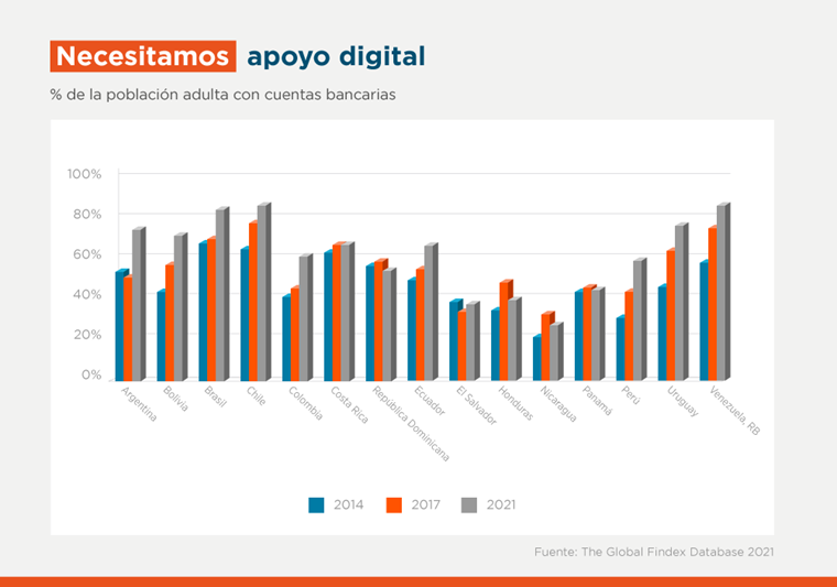Embora a diferença permaneça significativa, o aumento no número de pessoas bancarizadas na América Latina e no Caribe deveu-se principalmente à aceleração dos sistemas de pagamento digital no Brasil. Em 2014, 48% dos habitantes da região eram desbancarizados, número que caiu para 26% em 2021. No mesmo período, o percentual da população sem acesso ao sistema financeiro no Brasil passou de 32% para 16%. Isso teve um grande impacto no percentual total da região, já que se trata do país com maior densidade populacional.