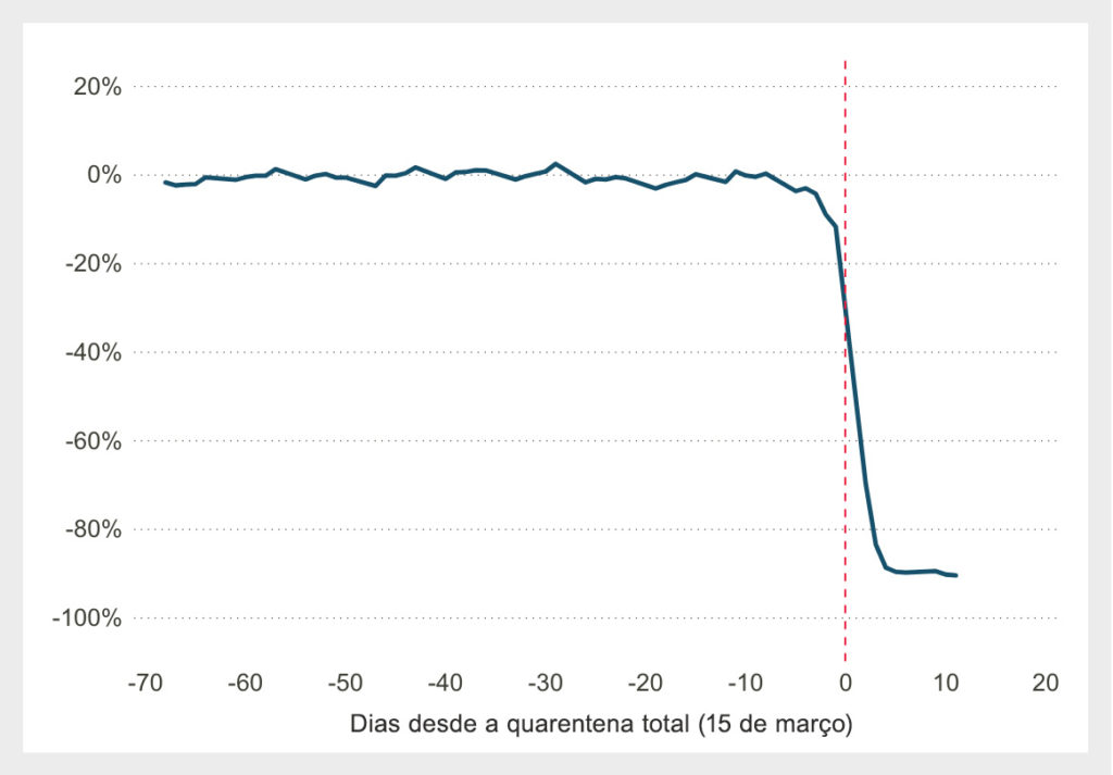 É evidente que o comportamento das pessoas está mudando rapidamente. Embora isso possa ser explicado parcialmente pelo medo, pelo desejo de evitar o contágio ou pelo compromisso pessoal de ajudar a reduzir a propagação da doença, as reações mais extremas parecem ser decorrentes das medidas impostas pelos governos. Por exemplo, na semana de 16 de março teve início um declínio acentuado do indicador de Intensidade dos Congestionamentos de Trânsito, momento em que quase todos os países da região já haviam implementado algum tipo de medida de distanciamento social. As regiões metropolitanas que se destacam são Lima (diminuição de 86%) e Port of Spain (diminuição de 83%). Embora possa ser cedo demais para determinar o impacto total das quarentenas e de outras medidas, até 26 de março Bogotá, Buenos Aires, Lima, Port of Spain e São Paulo haviam registrado uma diminuição de cerca de 90% ou mais nesse indicador. A análise dos dados de transporte público sugere padrões semelhantes. A Figura 2 mostra dados do uso do Metropolitano, o sistema de corredores exclusivos para ônibus (BRT) de Lima, onde a utilização do transporte público diminuiu cerca de 80% em comparação com os níveis normais. Além disso, dados do Moovit, um aplicativo de mobilidade urbana, mostram reduções que vão de 41% a 88% em cidades da América Latina (Figura 3).Figura 2. Variação da utilização do transporte público, Metropolitano, Lima, Peru