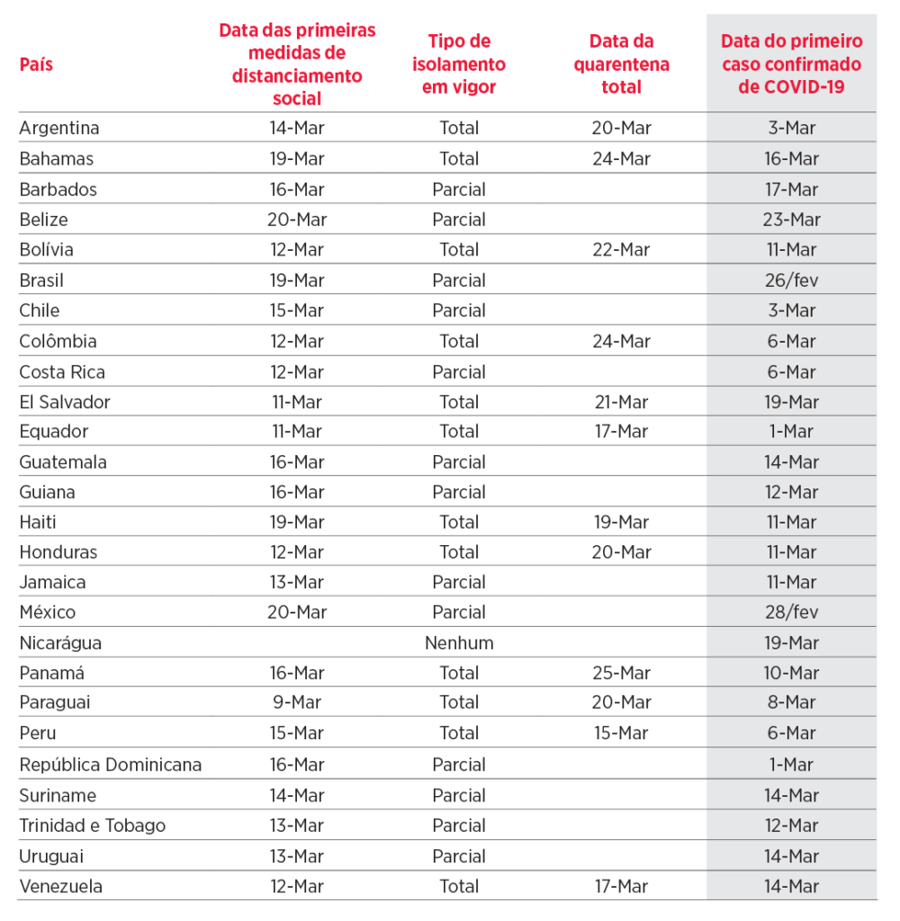 Tabela 1. Data dos primeiros casos de coronavírus e da implementação das respectivas medidas de distanciamento social e quarentenas na América Latina e Caribe