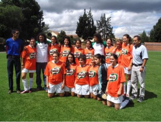 A autora com o time de futebol da sua escola e os jogadores profissionais colombianos René Higuita e Leonel Álvarez.Copa do Mundo Feminina: alguma coisa mudou?
