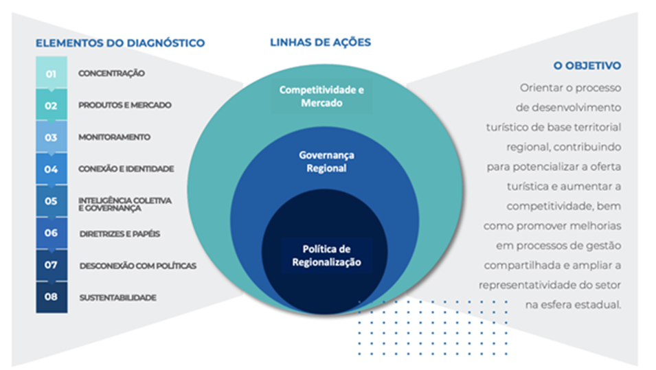 A lógica da estratégia parte da política de regionalização como linha de ação central, pois esta traz as bases para o trabalho da gestão regional que, por sua vez, influenciam na competitividade e no mercado. Não por acaso, a entrega final do projeto foi uma proposta normativa para institucionalização da política que apoiará na continuidade e visão de longo prazo.