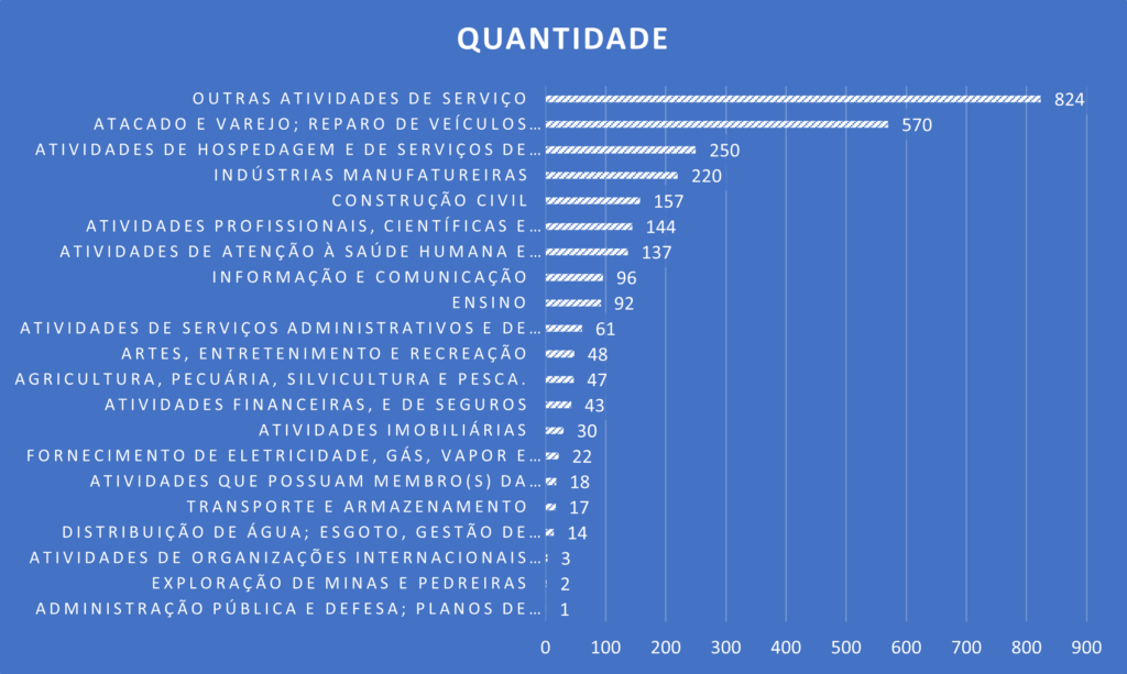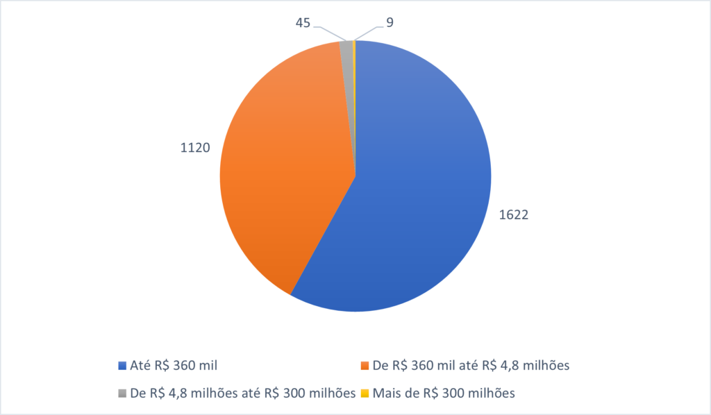 Quantidade de Empresas por Setor de AtividadeConsiderando a faixa de faturamento das empresas, a maior parte é composta por microempresas, com faturamento anual de até R$ 360 mil (1.622 – 58.01%):