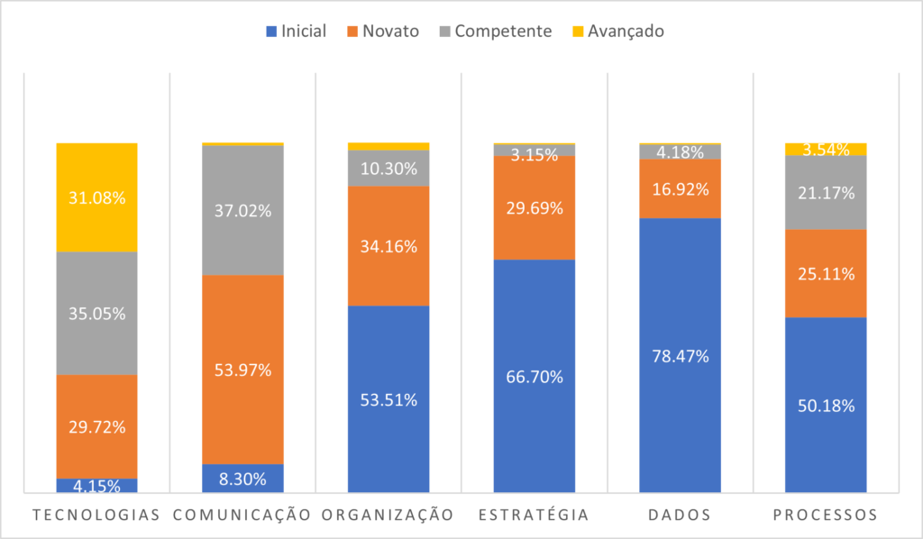 Maturidade digital das empresasA metodologia permite obter dados do nível de maturidade digital organizados em 6 dimensões: tecnologia; comunicação; organização; estratégia; dados e processos. As empresas analisadas apresentaram baixa maturidade digital na dimensão “dados”, compreendendo 78,47% das empresas classificadas no nível Inicial. Do total de empresas participantes da primeira fase de aplicação, o melhor desempenho foi identificado na dimensão “tecnologia”:
