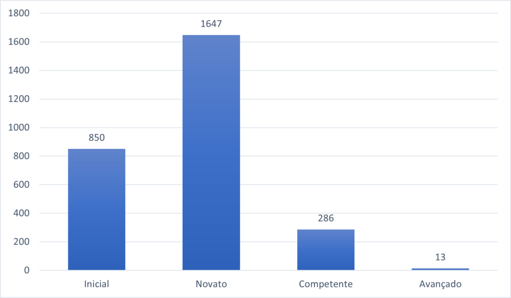 Empresas por faturamento anualDas empresas que concluíram o teste, 58,91% estão no nível de maturidade digital classificado como “novato”, indicando a existência de habilidades digitais básicas com a integração inicial das tecnologias para atender às necessidades de diferentes áreas da empresa. Apenas 13 empresas foram classificadas como “avançadas”: